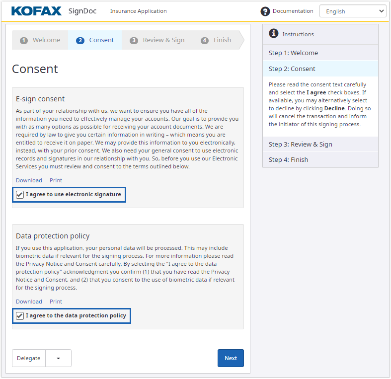 • The signer is required to accept both the E-sign consent and the GDPR consent. Then the page displays two consent areas: one for "E-sign consent" and another one for "Data protection policy."