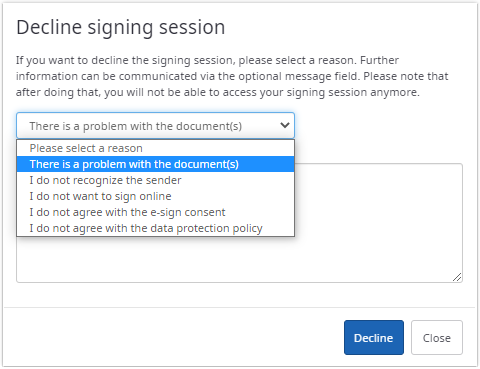 The recipient can select a reason from the list for declining and optionally type additional comments into a free text field.