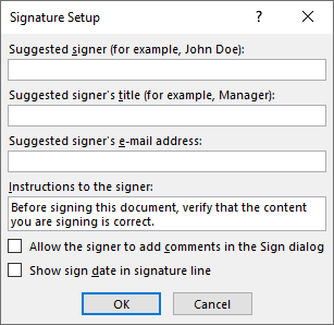 While creating a document in Microsoft Word insert a Microsoft Office Signature Line. Signature setup popup would be opened. Fill the form fields with exactly the same credentials as would be used for SignDoc signing.
