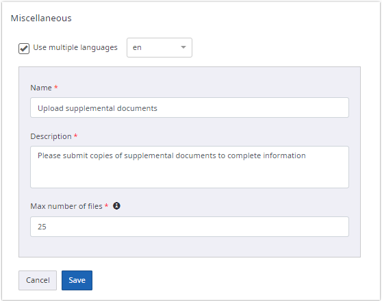 To add multiple translations to the document type, a user has to provide the English translation first. Then you can use the Use multiple languages check box to enable multiple translations for the document type. When selecting this option, the application displays the translation list. When you change the selected language and enter Name, Description and Max number of files, you enter the values for the selected language.