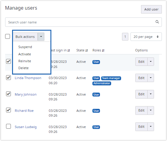 An account administrator is now able to reinvite an already invited user. This option is useful if the original email is lost or deleted. The action Reinvite is available for each invited user in the Manage users page. When the user provides a password the first time, the user becomes active and the Reinvite action is no longer available.