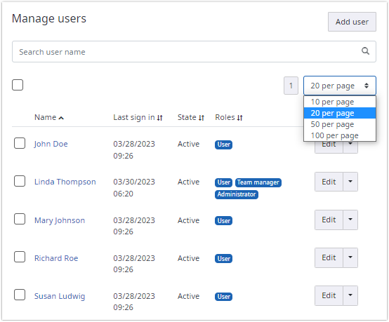 All users of the account are listed in alphabetical order. The number of presented items per page can be set, such as 20 users per page.