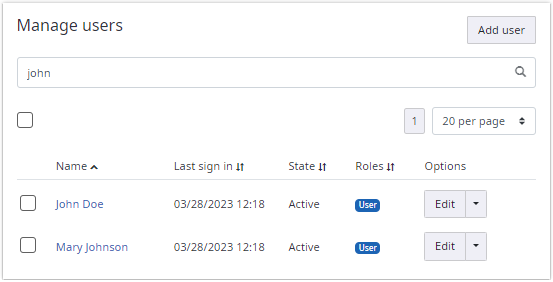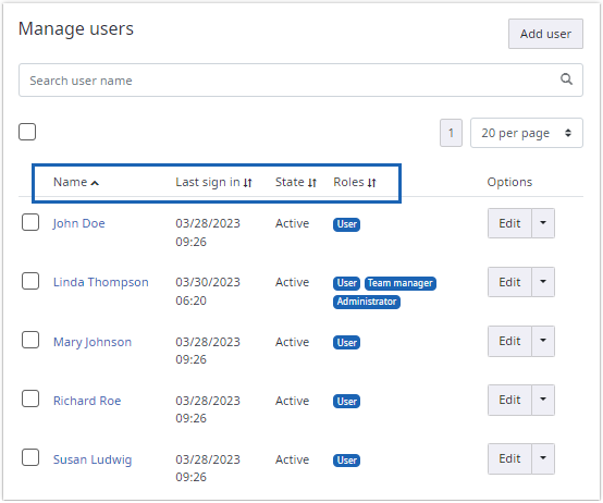 Users can be sorted by the columns Name, Last sign in, State, Roles.