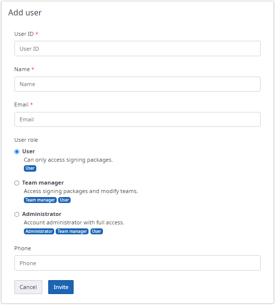 Enter the fields requested for creating the new user and select the preferred user roles. Enter a phone number. Then click Invite.