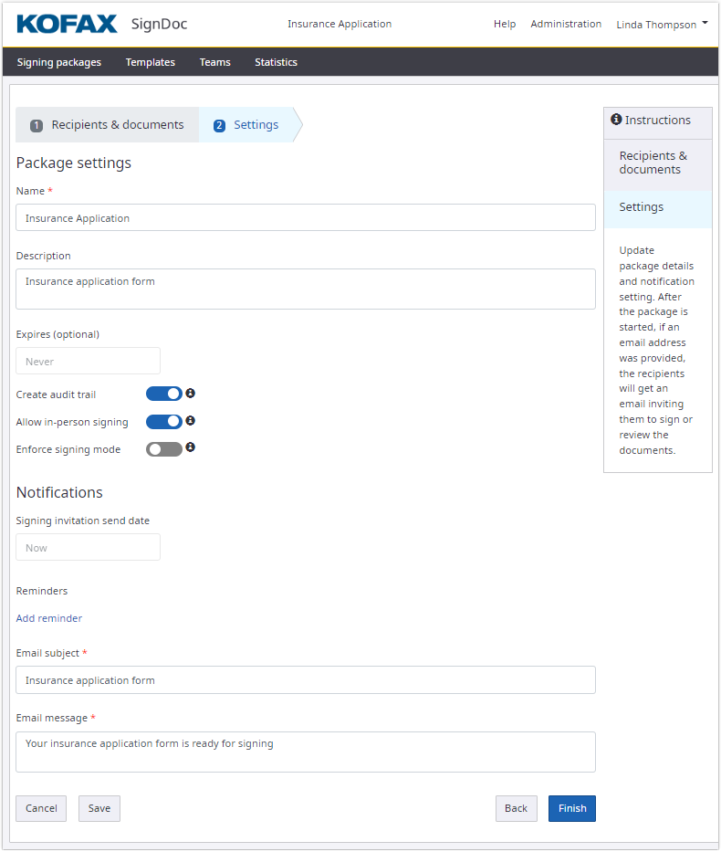 After the user clicks Finish, the signing package is prepared and ready to be started. Once the first remote recipient opens his signing session by clicking the link in the invitation email or an in-person signing session is triggered, the package changes to started state.