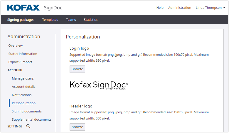 The personalization is visible to both the package owners and signing package recipient. Using the personalization options, you can set logos, headers, and footers.