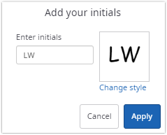 Now the recipient can click Apply to leave the dialog to use the entered initials in the selected style or click Cancel to leave the dialog without any changes.