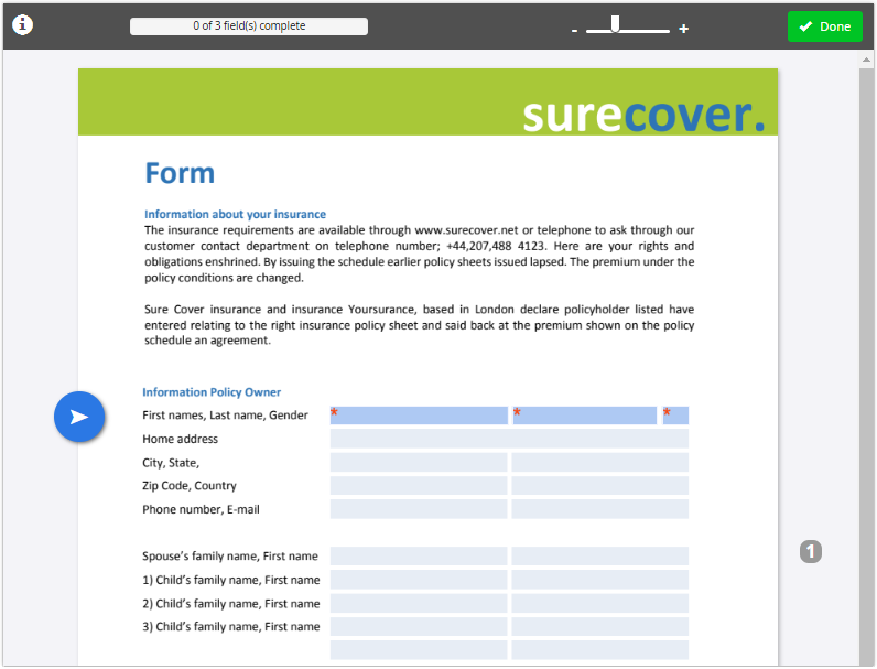A form filling guide is displayed on the left side of the page to assist navigation to the fields of the document. On mobile devices, this guide is shown in the toolbar. The guide points users in the direction of the next field. You can also click the guide to automatically scroll there.