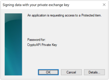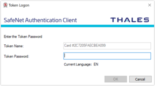 In this example the certificate is part of the SafeNet USB Hardware Token technology, and the vendor-specific dialog pops up to enter the token password.