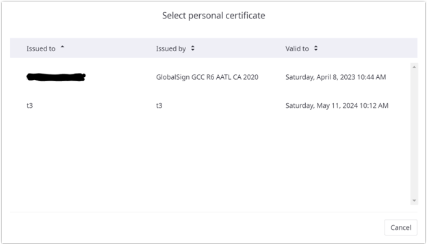 Suppose the Personal certificate signing method is allowed for the signature field and the corresponding software (Device Setup and certificate plug-in) is installed on the client computer. In that case, the signer can use a personal certificate by checking Use personal certificate.