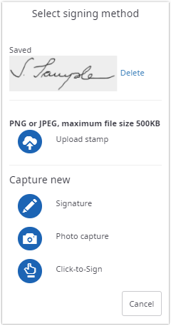 The following methods are available to sign a document: signature image, stamp image, signature, photo capture, or Click-to-Sign. When a TSP signature has been defined for a signature field. See TSP signatures in the signing process for a detailed description.