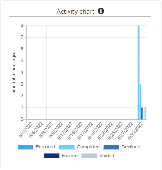 This chart displays dynamics of signing activity. It’s the bar chart representing the amount of packages by state and time. Selected timeframe is divided into 12 equal time units either it’s a year or a week. It provides the opportunity to see the dynamics for any selected timeframe. Please note that the graph represents every package state from prepared to finalization.