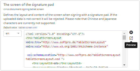 For xml files an inline XML editor is displayed when a user clicks the Open editor button. The XML editor supports auto-closing of XML tags, syntax highlighting and image preview (only available for specific settings).