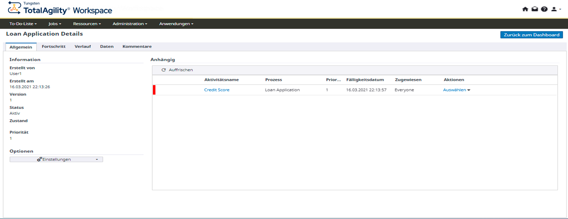 Allgemein: Diese Registerkarte enthält allgemeine Informationen wie den Ersteller der Anwendung, Erstellungszeit und -datum, Service-Level, Status, Zustand und Priorität und die offenen Aktivitäten. Sie können Aktionen durchführen und zum Beispiel Aktivitäten annehmen, Job-Eigenschaften anzeigen und Hinweise zu den Aktivitäten hinzufügen.
