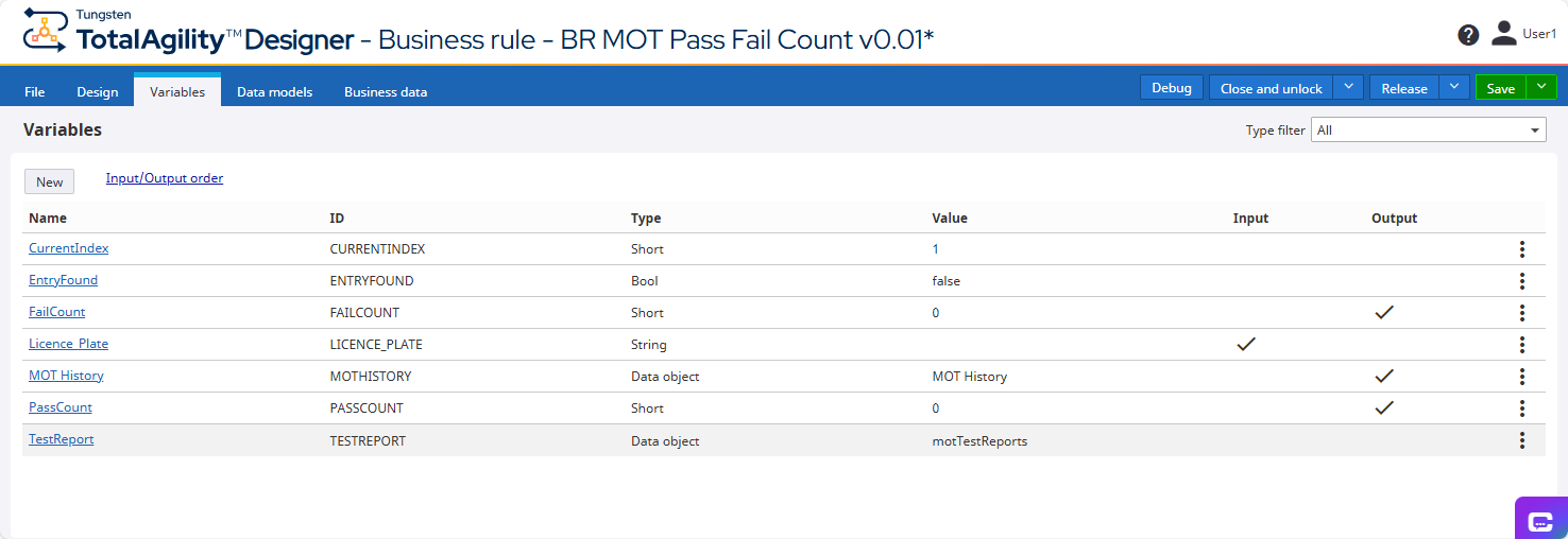 In this step you create one Data object variable and six other variables to use in the business rule.