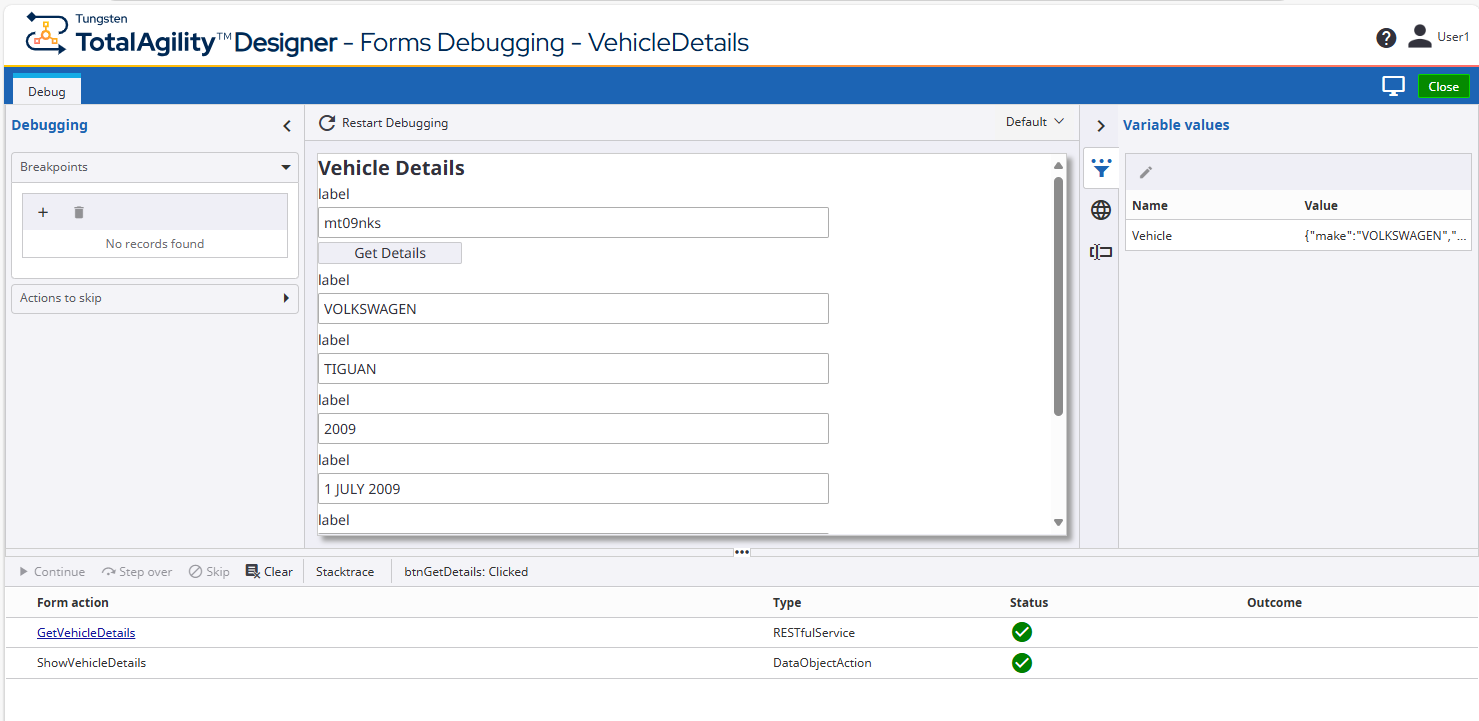 In this step, you test your form to see that all fields in your VehicleDetails form and Vehicle Data object form variable are populated.