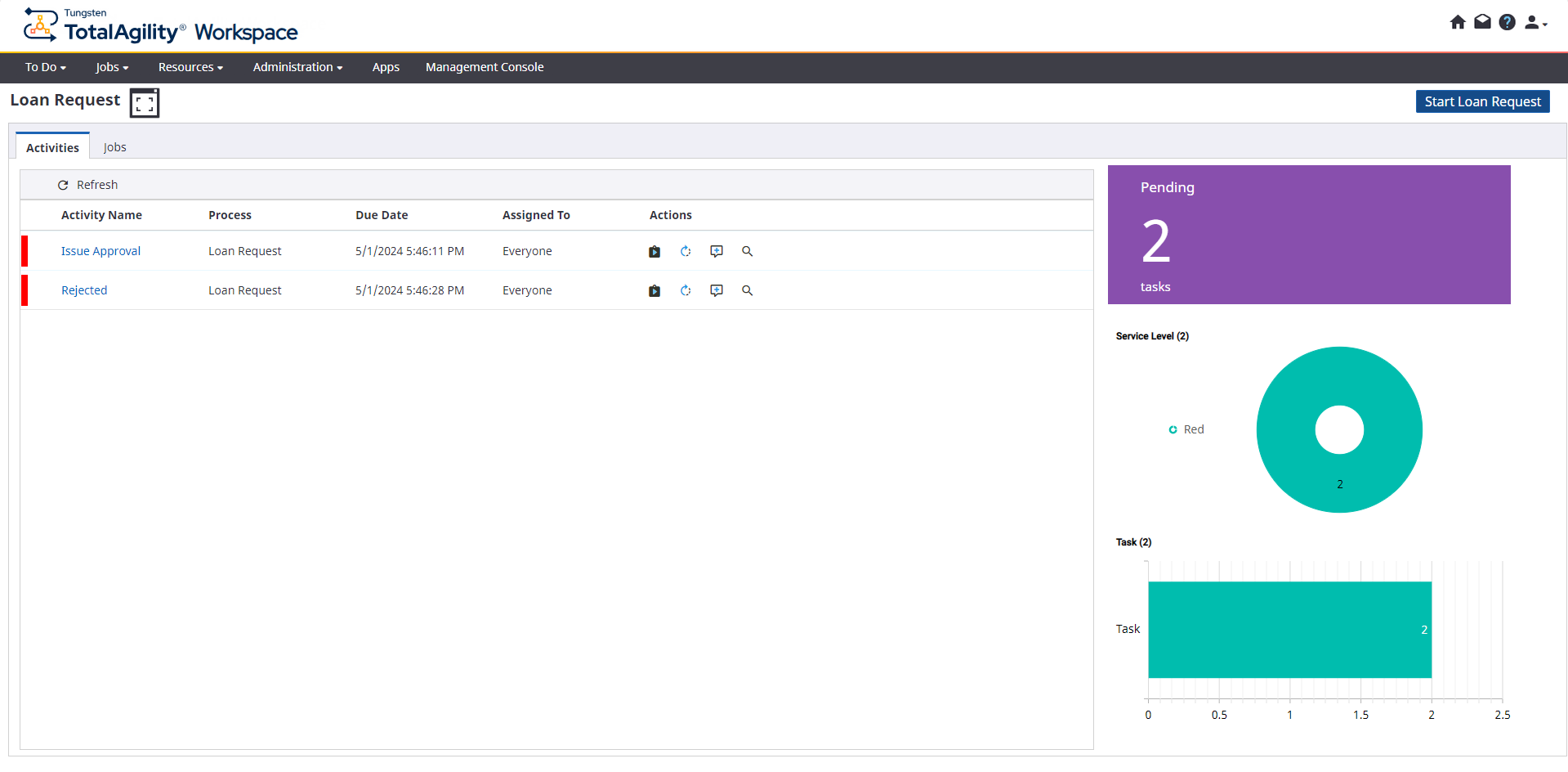 The applications published in Workflow are available in Workspace along with a landing page; this page provides a dashboard from which you can create new instances of your workflow, take and complete activities, view job properties, and monitor statistics on the jobs.