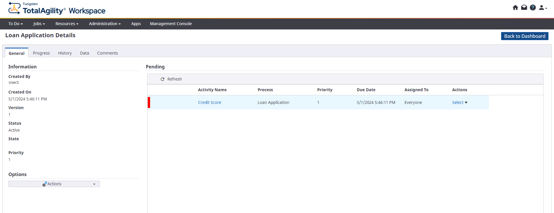 General: This tab includes general information such as the creator of the application, the time and date of creation, service level, status, state and priority and the activities that are open. You can perform actions such as take activities, view job properties and add notes to the activities.