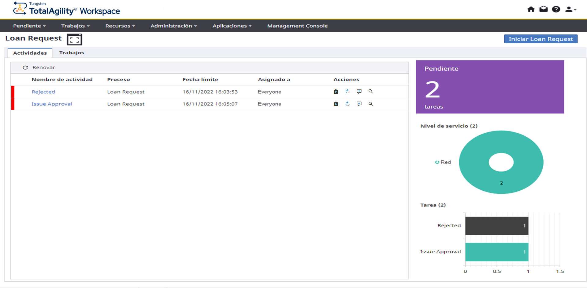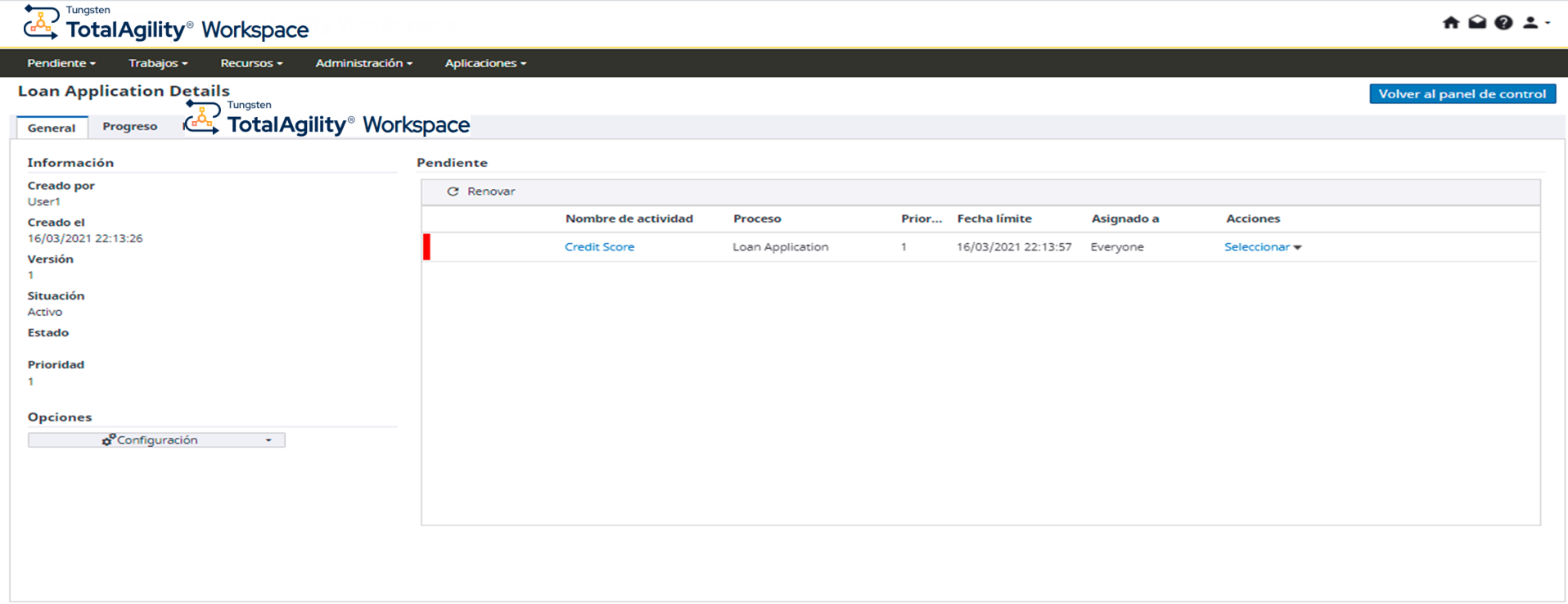 Trabajos: Esta opción le permite realizar diversas acciones sobre trabajos, como ver trabajos, terminar trabajos, agregar notas o cambiar estados. Para ver las propiedades del trabajo, haga clic en el enlace de la aplicación bajo Proceso, que le redirige al formulario de detalles del trabajo, que incluye las pestañas siguientes: