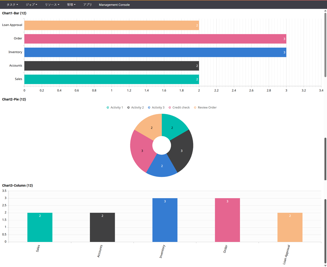 • グラフ 1 - 横棒グラフ: このグラフは、ライブ ジョブの数とそのジョブ プロセスの名前を表しています。このケースでは、在庫プロセスに 3 個のライブ ジョブが関連付けられており、販売には 2 個のジョブ、注文には 3 個のジョブ、ローン承認には 2 個のジョブがあり、アカウント プロセスには 2 個のライブ ジョブが関連付けられています。