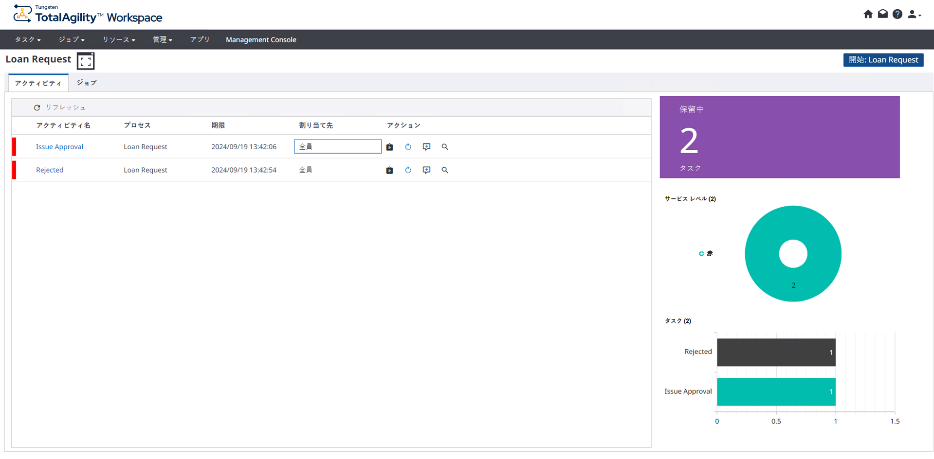 Quick Workflow で公開済みのアプリケーションは、ランディング ページとともに Workspace で利用できます。このページには、 ワークフローの新しいインスタンスの作成、アクティビティの実行と完了、ジョブ プロパティの表示、およびジョブの統計の監視を行うことができるダッシュボードが表示されます。