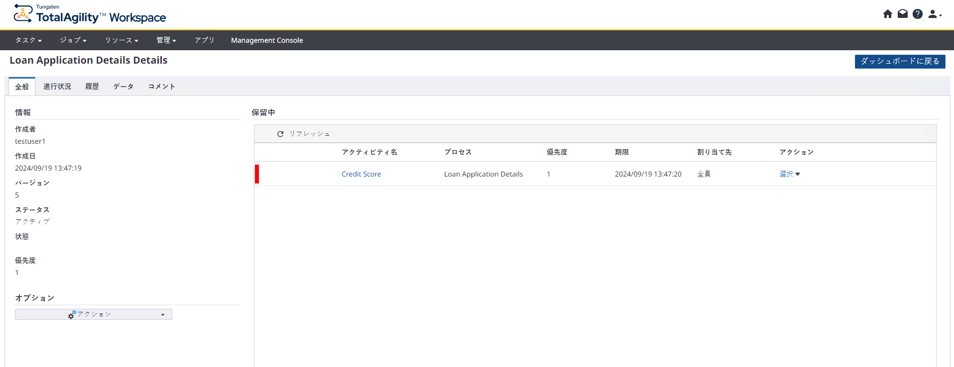[全般]: このタブには、アプリケーションの作成者、作成日時、サービス レベル、ステータス、状態と優先度、および開いているアクティビティなどの一般的な情報が表示されます。アクティビティの実行、ジョブ プロパティの表示、アクティビティへのメモの追加などのアクションを実行できます。