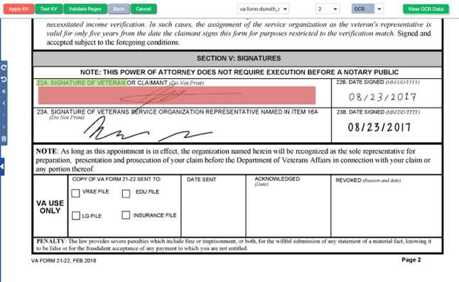 Intelligent Character Recognition (ICR) and Optical Mark Recognition (OMR) type KV rules use an algorithm that relies on a snippet of the value area from a document and sends that through a second ICR/OMR operation. These ICR/OMR type KV rules allow for quicker configuration than Fixed Form Extraction and is an alternative method of ICR/OMR configuration for certain use cases.