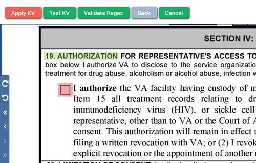 Verify that your filled check box is extracted properly. In the Advance KV Test panel, the Value column should return as "true". Also, the Confidence % column should have a number higher than your defined Pixel Density %.