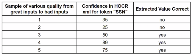Using multiple real-world documents, determine the threshold for when values are extracted properly. See the following sample results for documents of various quality.