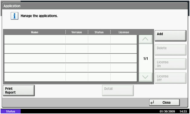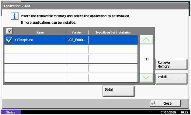 The MFP will confirm that the application installed correctly. Then, press the ‘Remove Memory’ button. After the MFP confirms that it is safe to remove the USB memory device, remove it from the MFP.