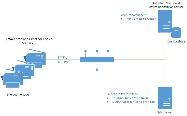The following figure illustrates the architecture for a system that includes Combined Client for Konica Minolta: