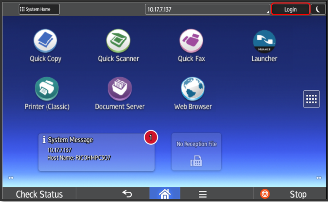 To login to Unified Client for Ricoh Smart Operation Panel 1.1, users must login from the SOP's login screen. This means the SOP must be running before logins are permitted. If the MFP displays the Ricoh Smart Operation Panel Home screen, users must first press the Login button on the top menu bar to start the Unified Client for Ricoh Smart Operation Panel 1.1.
