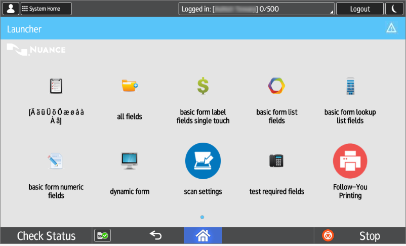 The Unified Client for Ricoh Smart Operation Panel 1.1 screen that appears depends on the settings that you configure when adding a device.