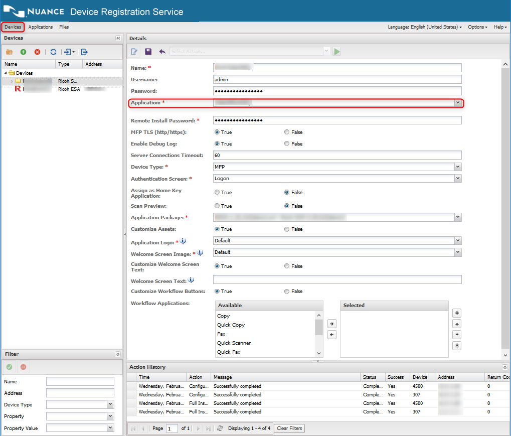 Ricoh PCC 5.1 device properties are configured in the Device Registration Service web console. When configured for a device group, they can be propagated to any device in the group.