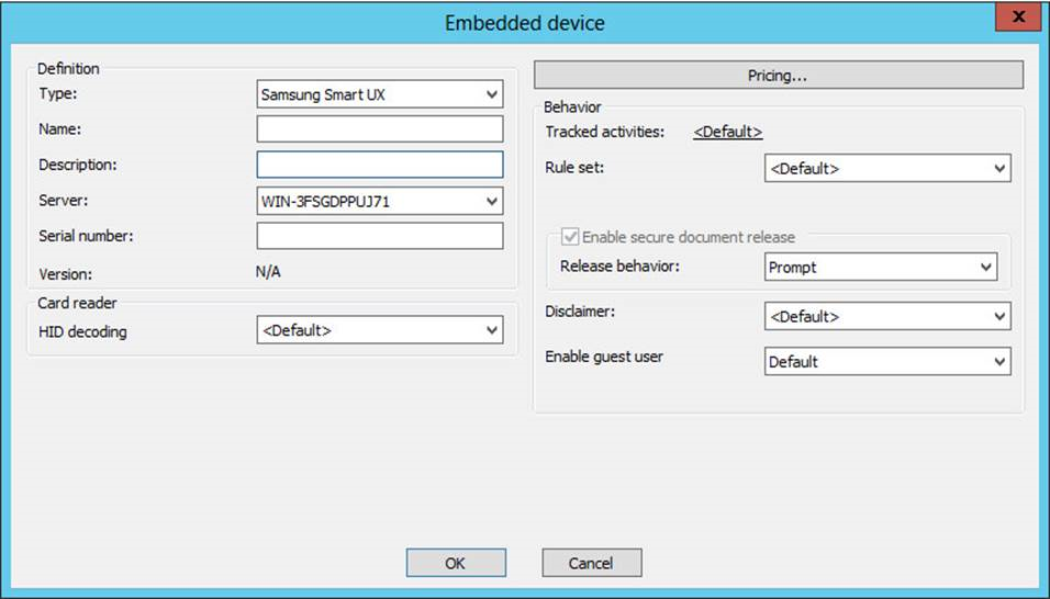Use the link to manually add an embedded device that is associated with a single physical device. This includes enabling Follow-You Printing and release behaviors, as well as copy, scan and fax access on each MFP.