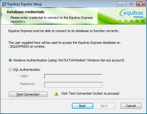 - Windows Authentication (default selection): select this option when the user running the Windows Service account connects to the database server. This user was specified on the Service Log On Credentials screen