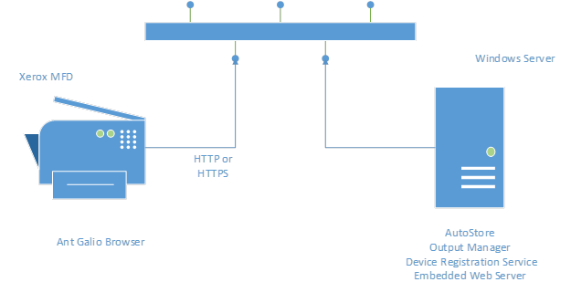 This Unified Client consists of a web client and authentication module on the AutoStore server. A Xerox MFD connects over the network to the web client using HTTP or HTTPS.