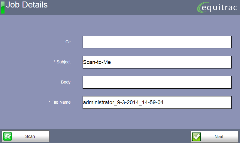 The fields for which you must provide information depend upon server settings and scan destination. The following table outlines the scan destinations and possible associated fields:Scan-to-Me Email Network SharePoint RightFax From P (auto fill option) P To P (auto fill option) P Cc P P Delivery Format P P P P Body P P Network Folder P Fax Number P File Name P P P P SharePoint Folder P Compress to Zip P P -