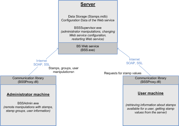 Bates Stamp Server works as a web service which interacts with its clients - administrators and users - through secure SSL channel.