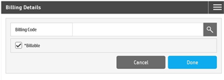 If the Billing Code validation is enabled, the billing code is validated when you select Done. If you searched for a code and selected it from the list, it is validated immediately. Billing code validation is set in Equitrac Web Client > System Configuration > Global Configuration Settings > User Interaction > Session Flow > Validate Billing Codes.