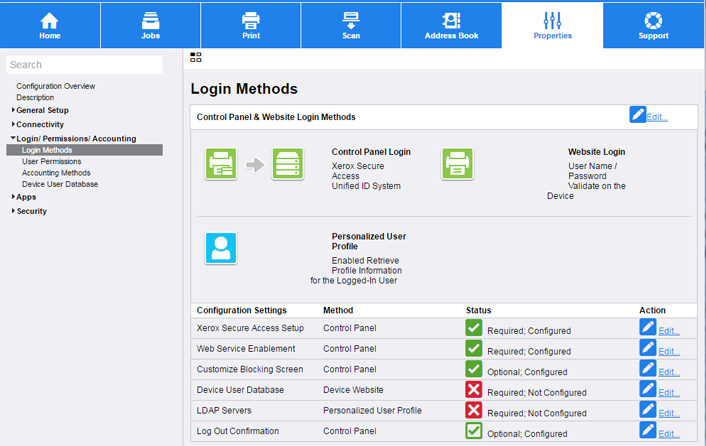 On the Login Methods page, click Edit next to Xerox