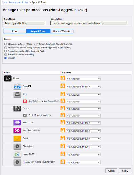 Not Allowed & Hidden - the service appears on the MFP control
