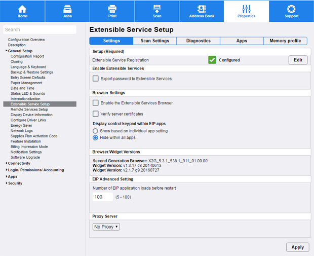 In the Browser Settings section on the Extensible Service Setup page, ensure