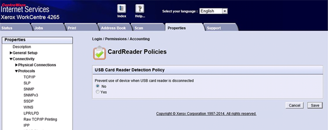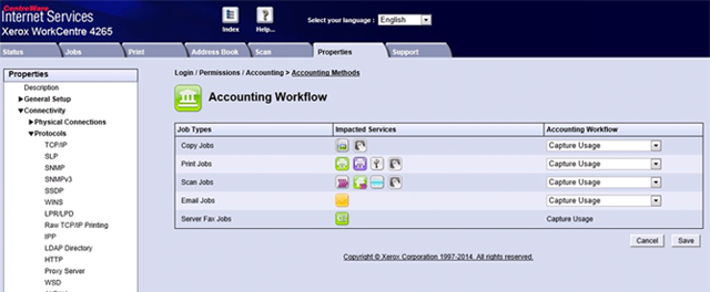 The Authentication & Accounting Configuration and Job Limits services must be enabled via the Internet Services interface.
