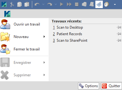Use the Kofax Express menu to access frequently used functions for creating new jobs, batches, and documents, and for basic operations. Also, use the Kofax Express menu to access the Recent Jobs list and the Options window, where you set operating preferences.