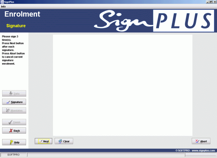 Please sign 3 times pressing the Next button after each signature. If you need to resign press Clear. By pressing Abort button you can cancel the current reference signature. In the case that it was already the second reference signature you will be able to get back to the previous enrolment by pressing Abort. Reference will be directly displayed in the signature area.
