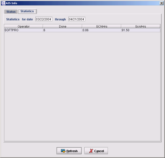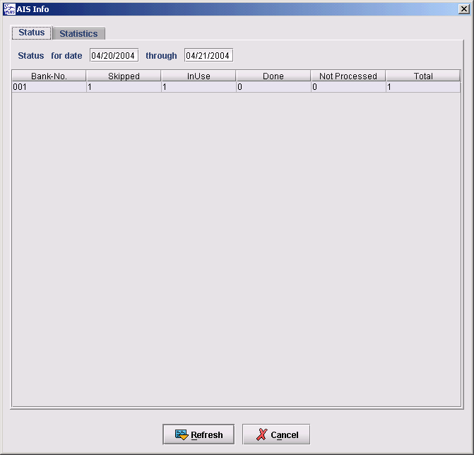 This dialog displays status information of the Archive Interface Server and statistic information as well. The data is displayed in two panels. The user can switch easily between the panels by just clicking the appropriate tabulator. The data is loaded from the AIS on first access of the panel automatically. An explicit refresh of the information can be forced by pressing the Refresh button.