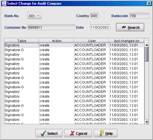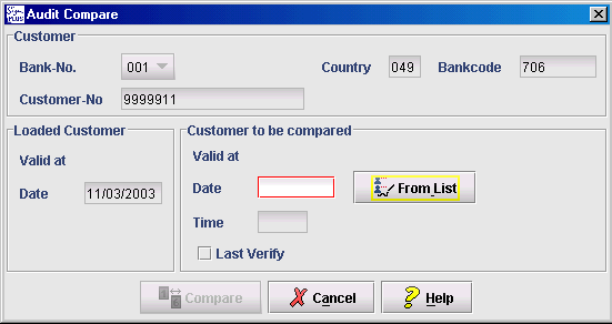 This dialog provides the capability to compare the status of the loaded customer / account against the same customer's / account‘s status at a given date (or date and time). It is accessible only if the current user has SignBase Audit rights and if a customer / account have already been loaded into SignBase.