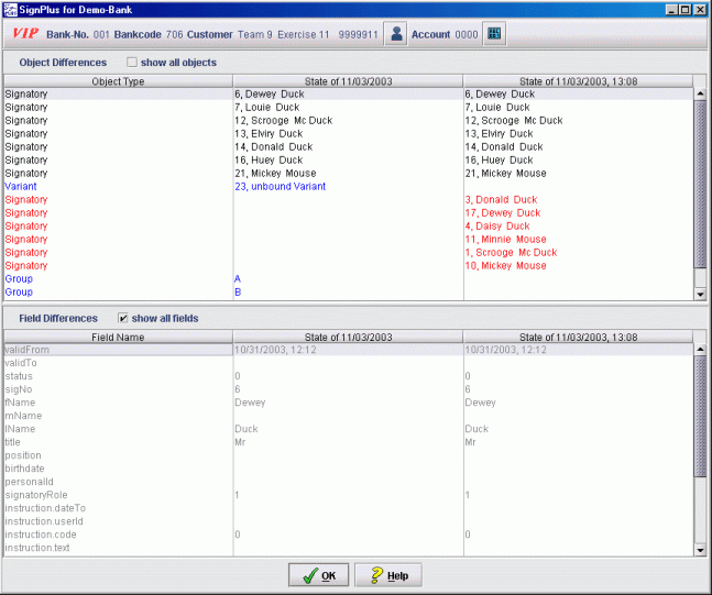 This data view displays the results comparing the status of the customer / account that is actually loaded against the same customer's / account‘s status at the selected date (or date and time). It contains two tables: