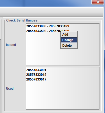 •The range with non-empty set of used cheque numbers cannot be deleted